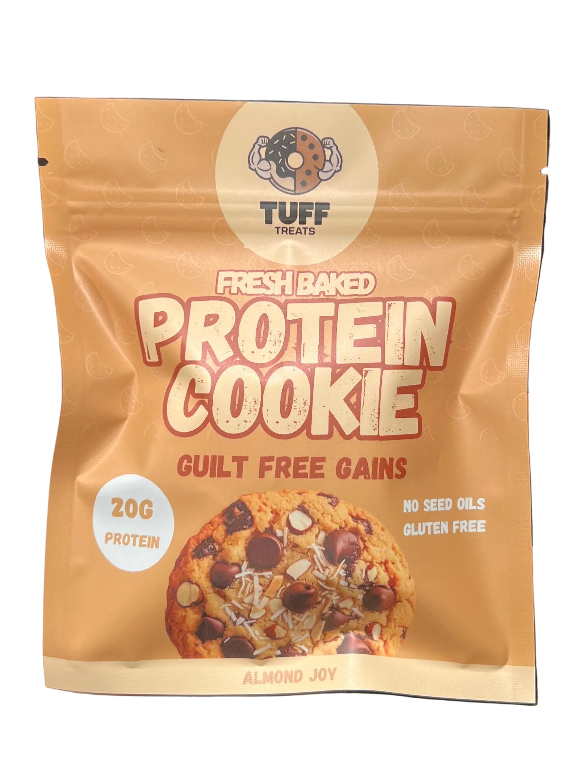 Ingredients: All-natural almond butter, Almond butter powder, Stevia, Whey Casein Protein Blend, Egg, Sugar-free dark chocolate chips, Coconut flakes, Almonds