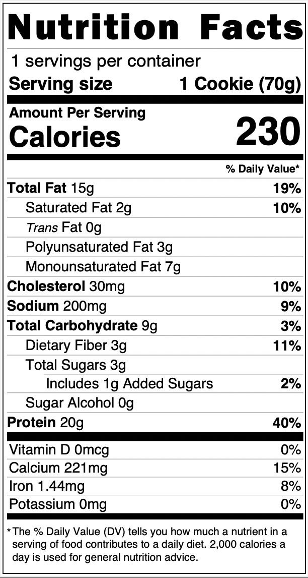 Ingredients: All-natural almond butter, Peanut butter powder, Stevia, Whey-Casein Protein Blend, Egg, Ground Cinnamon, Ginger, Nutmeg.